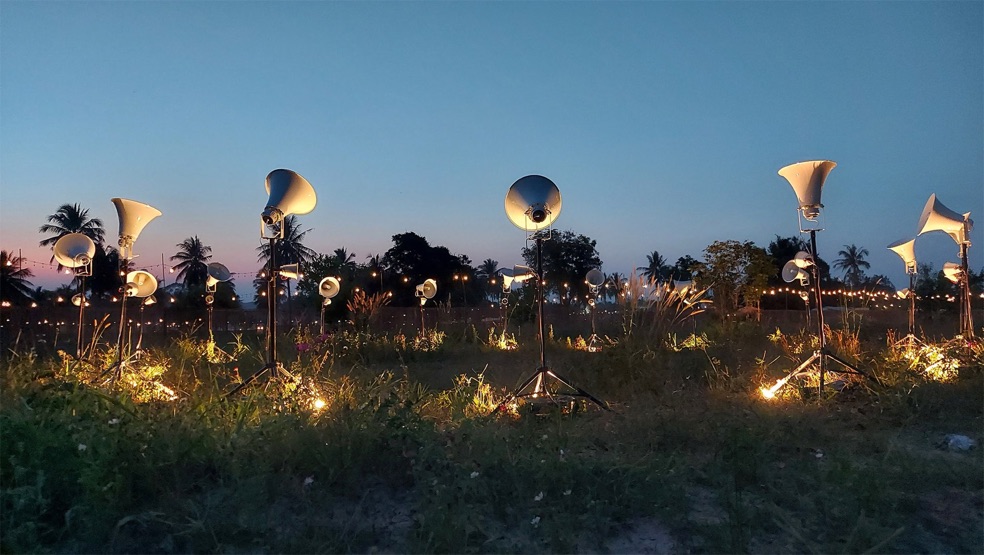 (at WonderFruit, Pattaya, 2019) to a pure frequency that builds into the sound structure of this room. Each frequency is independent and randomly connected. They are weaving to themselves and absorbed into people’s heads.